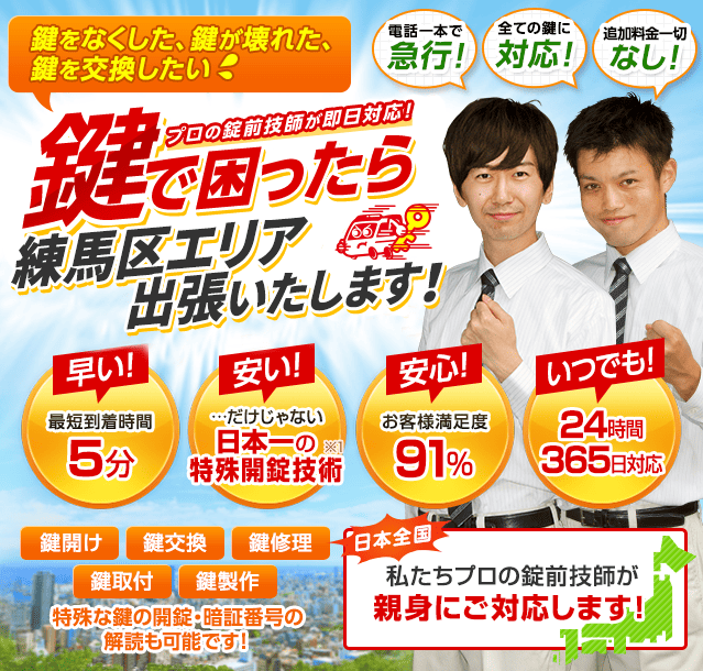 練馬区は、23区内でも面積の広い区で、そのほとんどが住宅地であることから鍵に関するトラブルも数多く発生します。その中でも鍵開けや鍵作成のご依頼は特に多くいただきます。