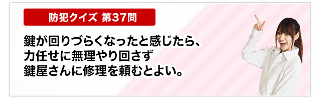 この間家に帰った時、きちんと鍵を閉めた筈なのに玄関の鍵が開いていました。もしかして、と思い家に入ると部屋の中がめちゃくちゃ。こちらに相談したところ、ピッキングが出来る種類の鍵だったようです。すぐに防犯性の高いものに交換して頂き、それ以来空き巣にも入られていません。ありがとうございました。