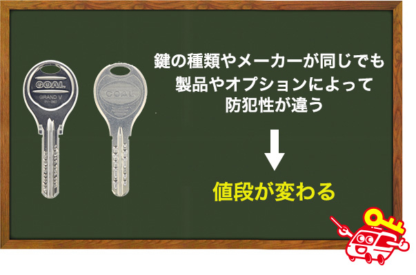 さらに細かく言うと、同じ鍵の種類でもメーカーやオプションによって防犯性が異なりますので、そこでも値段が変わります。